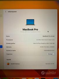 Vendo MacBook Pro 13” del 2017, configurazione Intel i5 dual-core 3,1 GHz, 8 GB RAM, SSD 500 GB, scheda grafica Intel Iris Plus 650, Touch Bar.