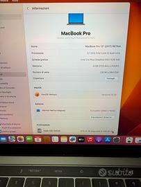 Vendo MacBook Pro 13” (2017) RETINA DISPLAY con TOUCH BAR ottimo condizioni perfettamente funzionante, con già installato Microsoft Office 2019 completo ————-caratteristiche————— *Versione - MacOS Ventura 13.7.1 ultimo aggiornamento *Processore - 3.1 GHz Intel Core i5 dual-core *Ram - 8GB 2133 MHz LPDDR3 *HardDisk - SSD 500GB *Scheda grafiche - Intel Iris Plus Graphics 650 1536MB *Batteria originale 84% 492 cicli *Carica batteria nuovo da 67W €30 (non incluso sul prezzo) Prezzo non trattabile assolutamente Ritiro in zona solo Bologna No spedizione No scambio