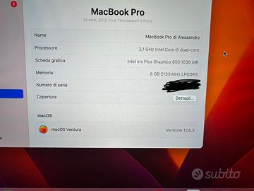 Vendo MacBook Pro 13” (2017) con Touch Bar in condizioni eccellenti, usato pochissimo e con pellicola sullo schermo. Intel Core i5, 8GB RAM, 512GB SSD,, batteria in ottimo stato (stato: Normale). Non presenza graffi sullo schermo Scambio a mano su roma