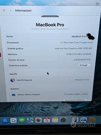 Vendo bellissimo MacBook Pro da 13 pollici (modello 2020) in condizioni estetiche e funzionali eccellenti. Il computer è perfetto per studenti, professionisti o per chi cerca un portatile potente, compatto e con l'iconica Touch Bar. Il dispositivo è già aggiornato all'ultima versione del sistema operativo macOS Sequoia. Caratteristiche Tecniche: • Processore: Intel Core i7 quad-core a 1,7 GHz (ottimo per multitasking e carichi di lavoro intensi). • Memoria RAM: 8 GB LPDDR3 a 2133 MHz. • Archiviazione: SSD da 250 GB (velocissimo). • Scheda Grafica: Intel Iris Plus Graphics 645. • Display: Retina da 13,3 pollici (risoluzione 2560 x 1600) con colori vividi e dettagli nitidi. • Porte: 2 porte Thunderbolt 3 (USB-C). • Sicurezza: Touch ID integrato nel tasto di accensione. • Batteria: Stato "Normale", con ottima tenuta della carica.