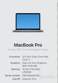 MACBOOK PRO 13` 3.5GHZ / 16GB RAM / 1TB disco SSD / IRIS+ GRAPHICS 650 GRIGIO SIDERALE acquistato nuovo ottobre 2018