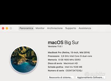 Vendo MacBook Pro 13” (Mid 2014) perfettamente funzionante e in buono stato. Un laptop affidabile, ideale per lavoro, studio o utilizzo quotidiano.