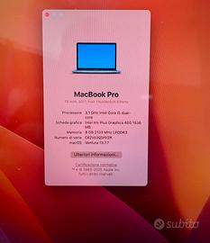 Vendo MacBook Pro 13” del 2017, perfettamente funzionante e in ottime condizioni estetiche. Software masOS Ventura Versione 13.7.8 Utilizzato sempre con cura, ideale per lavoro d’ufficio, navigazione, gestione email, Office e attività quotidiane. Caratteristiche principali: •Processore Intel Core i5 3.1 GHz •8 GB RAM •SSD 500 GB (veloce e capiente) •Display Retina 13,3” (2560x1600) •macOS Ventura aggiornato •4 porte Thunderbolt 3 Batteria: •639 cicli •Stato: normale (buona autonomia) Condizioni: •Nessun difetto funzionale •Normali segni di utilizzo, molto ben tenuto e tastiera revisionata recentemente da Apple Incluso: •Alimentatore originale Apple Motivo vendita: Passaggio a modello più recente. Prezzo leggermente trattabile. Consegna a mano (zona Como), non lo spediamo.