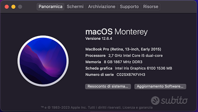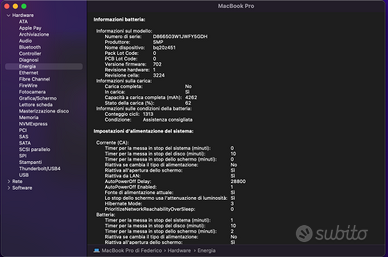 Processore: Intel Core i5 dual-core a 2,7 GHz Memoria RAM: 8 GB DDR3 a 1867 MHz Grafica: Intel Iris Graphics 6100 (1536 MB) Archiviazione: SSD originale Apple Sistema Operativo: macOS Monterey (versione 12.6.4) Il computer è ancora molto fluido e performante nell'uso quotidiano (navigazione web, pacchetto Office, streaming), tuttavia presenta alcuni difetti legati all'usura di cui tenere conto: Difetti riscontrati: Batteria: Ha raggiunto i 1313 cicli. Il sistema consiglia la sostituzione; l'autonomia è limitata, quindi è preferibile usarlo collegato all'alimentatore o prevedere un cambio batteria. Microfono: Non funzionante. Per chiamate o registrazioni è necessario utilizzare cuffie con microfono o un microfono esterno USB. Schermo (Staingate): Presenta il noto problema del deterioramento del rivestimento antiriflesso tipico di questa serie. Il difetto è estetico e visibile soprattutto a schermo spento, ma non pregiudica la visualizzazione dei contenuti una volta acceso. Nonostante i segni del tempo, questo modello è celebre per essere uno dei MacBook più affidabili mai prodotti (l'ultimo con tutte le porte: USB-A, HDMI, lettore SD e MagSafe). È perfetto come postazione fissa, per studenti o per chi cerca un muletto affidabile a un prezzo contenuto.