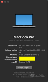 MacBook Pro 13-inch (2019) in ottime condizioni, perfetto per lavoro, studio, programmazione, grafica e utilizzo quotidiano. Specifiche tecniche: Archiviazione: 512 GB SSD (velocissimo e capiente) Processore: 2,4 GHz Intel Core i5 quad-core Scheda grafica: Intel Iris Plus Graphics 655 (1536 MB) Memoria RAM: 16 GB 2133 MHz LPDDR3 Display Retina 13” brillante e definito Ottima autonomia della batteria