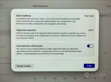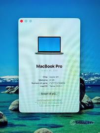 MacBook Pro 13" M1 (Late 2020) - Space Gray Modello A2338 - Ricondizionato Grado A- SPECIFICHE - Chip Apple M1 (CPU 8-core, GPU 8-core) - 8 GB di memoria unificata - SSD 256 GB - Display Retina 13,3" (2560x1600) - Touch Bar + Touch ID - Wi-Fi 6, Bluetooth 5.0 - Due porte Thunderbolt/USB 4 RICONDIZIONAMENTO ESEGUITO - Schermo Retina sostituito con pannello ORIGINALE Apple: condizioni pari al nuovo, nessun graffio, colori perfetti - Installazione pulita di macOS, pronto all'uso dal primo avvio - Pulizia approfondita di tutti i componenti interni ed esterni, ventola e dissipazione inclusi STATO BATTERIA Capacità massima all'84%, ancora ampiamente utilizzabile per diverse ore di autonomia. CONDIZIONI (il "meno" del Grado A-) Due piccole imperfezioni estetiche alle estremità della scocca inferiore, visibili leggermente solo a laptop capovolto. Non influiscono sul funzionamento. Ogni altro componente è in ottime condizioni, schermo incluso, senza ammaccature né graffi rilevanti. NOTA Venduto senza alimentatore e senza accessori. È sufficiente un qualsiasi caricatore USB-C (minimo 30W, consigliato 61W). Prezzo: 549 €. Disponibile per visione e prova senza impegno.