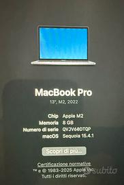 Vendesi macbook pro 13” m2 con 256gb ssd e 8gb come nuova, 60 cicli di carica, ideale per chi lavora con software pesanti, potentissima e non scalda, il touch id non funziona do anche il ricambio originale da sostituire se lo volete cambia se non volete potete lasciarlo come è tanto non influisce niente nel funzionamento del compiuter io lo ho usato cosi per anni è non ne avevo bisogno.