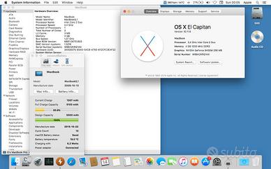 Macbook pro 13 del 2008 A1278 in vendita parzialmente funzionante e ottimamente tenuto è 2,4GHZ con 4 GB di memoria DDR3 Hard disk da 500GB Impercettibili graffi, nulla di che, monitor ottimo !Disco cambiato dalla proprietaria batteria ancora molto buona, cambiata poco tempo fa. Ha dei difetti ,la tastiera non viene riconosciuta come neppure il trackpad, veniva usato con tastiera e mouse bluetooth Ma tutto il resto funzionante perfettamente. venduto con alimentatore e confezione originale come mostrato in foto. OS El Capitan velocissimo e non scalda . no perditempo preferisco scambio a mano cosi lo visionate si prega sempre di chiede prima di acquistare GRAZIE