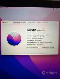 Vendo Apple MacBook Pro retina da 13 pollici del 2015 perfettamente funzionante, processore 2,7 GHz Intel core i5 dual core, ram 8 GB, archiviazione 121 GB, sistema operativo macOS Monterey. Unico difetto, la pellicola antiriflesso rovinata sullo schermo come potete vedere dalle foto.