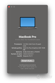 Vendo Apple macbook pro 13 pollici, intel i5 1.4Ghz, 8GB RAM 256GB DISCO TASTIERA ITA, touch bar, macOS Sequoia. Ottime condizioni, stato batteria normale. Solo ritiro a mano.