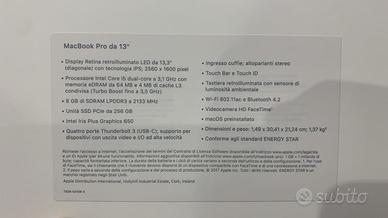 Apple Macbook Pro 13 pollici, anno 2018, con touchbar, 8GB RAM, 256 di archiviazione SSD.