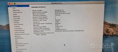 MacBook Pro, Hard disk SSD da 1 Terabyte, 8Gb di ram, tastiera Inglese internazionale, casse da cambiare il tweeter, perfettamente funzionante. Uso prettamente casalingo