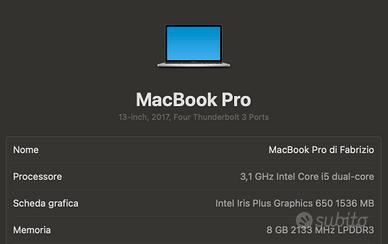 macbook pro 13 pollici del 2017 touchbar i5 3,1GHz, 8gb ram, 250gb hdd