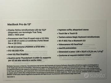 Vendo un MacBook Pro (13 pollici, 2020) con: * processore Intel Core i5, * 16GB di RAM (e questa fa la differenza con gli 8gb che trovare in giro), * 512GB di memoria SSD, * dotato di Magic Keyboard e quattro porte Thunderbolt 3, * caricabatteria e cavo originale in condizioni immacolate . Finitura in grigio siderale, il laptop è in condizioni perfette, senza graffi o segni di usura, come nuovo. Il MacBook Pro è stato trattato con la massima cura e viene fornito con tutti gli accessori originali. È l’ideale per professionisti e studenti che cercano un dispositivo potente e affidabile per il lavoro o lo studio. Per ulteriori informazioni o per organizzare un appuntamento, non esitare a contattarmi.