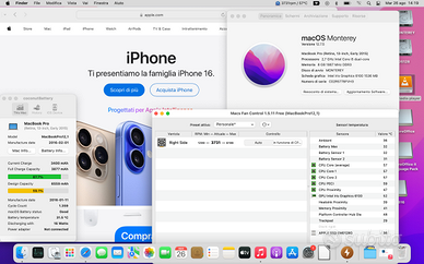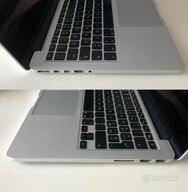 MacBook Pro 13" a 2,7GHZ i5 del 2015 prodotto febbraio 2016 batteria buona 1357 cicli che dura oltre 2,5 ore io ci ho visto un paio di film e tiene bene ! Questo portatile è stato tenuto bene. Monitor pulito e senza graffi sul case presenta solo due segni irrilevanti negli angoli. Ho installato con la patch OpenCore 2.4 Ventura 13 che gira fluido e veloce. Ma con il suo software Monterey è perfetto e reattivo Il suo SSD NVMe da 128 GB è sufficientemente veloce per tutti i tasks! In automatico faccio partire MacFansControl per raffreddare il piccolo processore i5 che non sfigura affatto su questa macchina. Ripulito dalla polvere cambiata la pasta e tutto funziona benissimo. Comprensivo del suo alimentatore . Ho installato un paio di software che vi lascio che servono per verificare il MacBook Pro 12.1 e inoltre una versione di open OFFICE Prediligo consegna a mano cosi lo provate No perditempo grazie