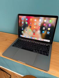 MacBook Pro 13” Touch Bar – Intel i5 – 8GB RAM – 256GB SSD Vendo MacBook Pro 13 pollici con Touch Bar, colore Grigio Siderale, perfettamente funzionante e completo di scatola originale, in omaggio due cover con protezione tastiera, una custodia porta pc imbottita Incase e il magic mouse bianco. Specifiche tecniche Modello: MacBook Pro 13” (A1706) Processore: Intel Core i5 2.9 GHz RAM: 8 GB LPDDR3 Archiviazione: SSD 256 GB Schermo: Retina 13” (2560×1600) Grafica: Intel Iris Graphics 550 Touch Bar & Touch ID Porte: 4 Thunderbolt 3 (USB‑C) Tastiera: Italiana Colore: Space Gray Usato con cura Nessun difetto di funzionamento ne di batteria