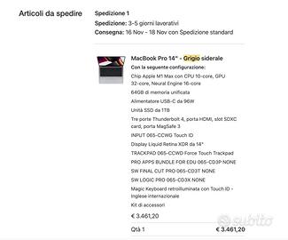 Vendo il mio Apple MacBook Pro 14" (2021) acquistato a fine 2022. Top di gamma - con potente chip M1 Max (CPU 10-core, GPU 32-core), 64GB di memoria unificata e SSD da 1TB.