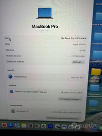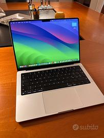 Anno 2021 Apple Silicon M1 Pro, GPU 14-core a 2 GHz 16 GB di memoria Unificata Unità SSD 512 GB Display Display Retina da 14.2" Perfetto. Usato solo come desktop. Imballo originale con scatola. Comperato il 24 gennaio 2022 per un costo di Euro 2.300 ca. Stato Batteria normale. Imballi originali presenti