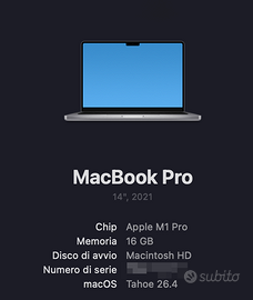 Macbook Pro 14" M1 16GB RAM - 580 cicli batteria