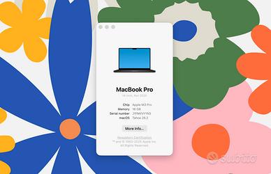 Vendo per passaggio a workstation per calcolo 3D/AI locale splendido MacBook Pro 14" M3 Pro. Usato esclusivamente in studio , tenuto maniacalmente sempre in custodia. Nessun graffio, difetto o segno d'usura. ⚙️ SPECIFICHE TECNICHE: * Processore: Apple M3 Pro * RAM: 18GB Memoria Unificata (ideale per suite Adobe, video 4K, Figma) * Archiviazione: 512 GB SSD * Display: Liquid Retina XDR 14" a 120Hz * OS: macOS Tahoe 26.2 * Batteria: Salute eccellente, solo 191 cicli (salute della batteria 96%) * Tastiera: Layout ITA, tasti perfetti 📦 INCLUSO: * MacBook Pro 14" M3 Pro * Scatola e imballaggi originali * Cavo MagSafe e alimentatore originali 🤝 CONDIZIONI DI VENDITA: * Prezzo: 1.450€ (leggermente trattabili) * Solo scambio a mano: Zona Milano/Saronno/Rozzano, disponibile a qualsiasi prova dal vivo. * Pagamento: Esclusivamente bonifico istantaneo allo scambio. * NO spedizioni, NO scambi, NO affaristi o ribassi assurdi. Massima serietà.