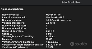 MacBook Pro Retina, 15 pollici, Mid 2015. Processore 2,8 Ghz Intel Core i7 Quad-Core Doppia scheda grafica Intel Iris Pro + AMD Radeon R9 M370X con 2 GB di memoria GDDR5. 16 GB RAM, 1 TB SSD Unico proprietario, tenuto sempre con grande attenzione. Batteria sostituita a Febbraio 2024, attualmente dura 8 ore e mezzo. Speaker sostituiti ad Ottobre 2025. Schermo perfetto, non presenta quel problema che alcuni lamentano sui retina che fanno macchie a causa della tastiera. La plastica del cavetto del caricabatterie si era un po' rovinato e l'ho coperto con nastro isolante.