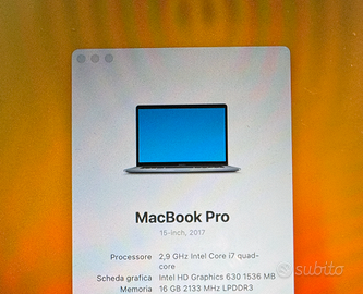 Vendo MacBook Pro 15 pollici 2017 (MacBookPro14,3), perfettamente funzionante e in ottime condizioni estetiche.