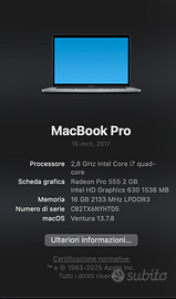 Vendo MacBook Pro 15 pollici modello 2017 in ottime condizioni e perfettamente funzionante.