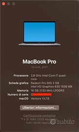 MacBook Pro 15” – 2017 – i7 2.8 GHz – 16 GB RAM – Radeon Pro 555 2GB – PERFETTO