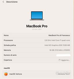 vendo macbook pro 15" di fine 2017 appena ricondizionato, sono stati sostituiti tutta scocca, compresa tastiera, batteria, trackpad e la touchbar.