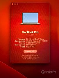 Vendo MacBook Pro 15 pollici (2018) perfettamente funzionante, per passaggio a sistema superiore. Intel Core i7 6 core 2,2 GHz 16 GB RAM DDR4 2400 MHz SSD 256 GB Intel UHD Graphics 630 Display Retina 15" macOS Sequoia 15.7.4 Computer ancora molto performante, ideale per: lavoro, studio, editing foto/video e utilizzo professionale quotidiano Condizioni estetiche molto buone, presente solo una piccola ammaccatura su un angolo, puramente estetica e visibile in foto, senza alcun effetto sul funzionamento. Completo di alimentatore Disponibile per prova, preferibile consegna a mano o spedizione da concordare.