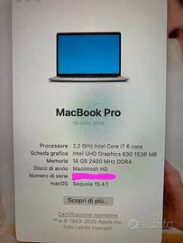 Processore Intel Core i7 6‑core a 2,2GHz (Turbo Boost fino a 4,1GHz) con 9MB di cache L3 condivisa Archiviazione Unità SSD da 512GB