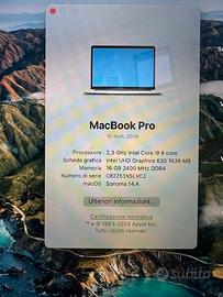 Computer pari al nuovo, MacBook Pro 15" 2019 con HD da 500gb e 16gb di RAM completo di caricabatterie e cavo di ricarica, come potete vedere dalle foto unico difetto estetico sono alle estemità anteriore del PC per il resto è un prodotto pari al nuovo sia per utilizzo che per l'integrita della scocca.