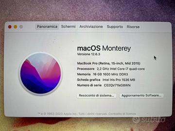 Unità di memoria flash da 251 GB, Display Retina - schermo da 15.4" risoluzione 2880 x 1800 pixel