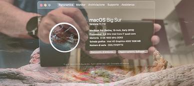 Macbook Pro 15 Retina Early 2013 con alimentatore originale Magsafe2. Ottime condizioni. Aggiornato al sistema operativo MacOs BigSur. SSD da 256 gbyte Processore Intel i7 quad core 8 gbyte di memoria ram.