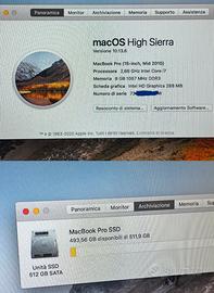 MacBook Pro 15", Mid 2010, 512GB Processore 2,66 GHz Intel Core 17 Memoria 8 GB 1067 MHz DDR3 Scheda grafica Intel HD Graphics 288 MB Completamente funzionante, ottime condizioni, schermo senza graffi o segni, tutto perfetto. Con caricatore originale Apple. Drive CD/DVD funzionante. Batteria conta 55 cicli di ricarica. High Sierra.