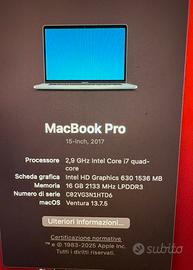 Vendo macbook pro 2017 praticamente immacolato. Con caratteristiche come da foto e titolo. C’e solo una lieve ammaccatura alla scocca in un angolo ma per il resto funziona perfettamente. No pixel bruciati o malfunzionamenti. Modello con touchbar quasi introvabile ormai. Batteria in ottimo stato come da foto.