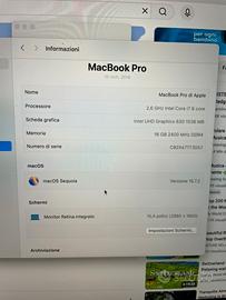 Macbook Pro 15’ touchbar e touch id 16gb ram 512gb ssd processore i7 6 core , sistema operativo Sequoia batteria nuova 3 cicli con caricabatteria e scatola originale . Condizioni pari a nuovo . No offerte no perditempo