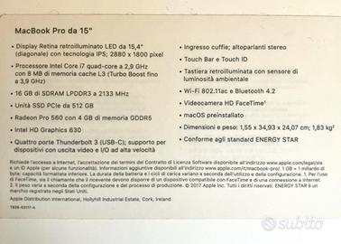 Vendo potentissimo MacBook Pro 15" (2017) con Touch Bar e Touch ID, in condizioni pari al nuovo, usato pochissimo solamente per produzione musicale.