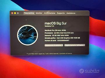 Vendo questo meraviglioso MacBook PRO di fine 2019. Processore: Intel Core i9 8 core 2,3 GHz RAM: 32GB Scheda Grafica: AMD Radeon PRO 5500M 8GB! Disco: 2TB SSD E' stato un modello TOP di gamma, questa è la versione maxata. Ha tutto al massimo. Ci sono alcuni segni di usura sulla scocca (in foto) e due porte type-c sono leggermente scolorite, per il resto esteticamente è perfetto. La batteria ha 566 cicli, è ancora quella originale, il Mac non è stato mai aperto. Purtroppo la batteria segnala "assistenza necessaria" sebbene tenga ancora e sia utilizzabile senza alimentatore, quando fa così di solito la sostituzione è praticamente necessaria. Per il resto c'è poco da dire, funziona tutto perfettamente e nonostante l'età il processore è ancora una bomba e va fortissimo. Incluso alimentatore originale type-C originale e nuovo di pacca. Spedizione in tutta italia