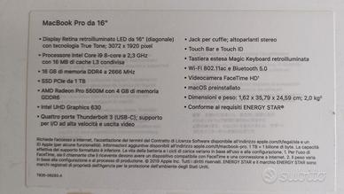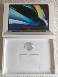 Vendo bellissimo MacBook Pro 16'' 2019, tenuto maniacalmente, senza graffi strisci, tastiera con lettere ancora belle vive, display perfetto e senza strisci o aloni. Completo di sua confezione e vendo assieme accessori astuccio + plastiche protettive.