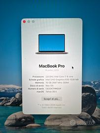 Vendo per passaggio a nuovo computer questo stupendo MacBook Pro versione 2019 con 512 GB di memoria SSD e 16 GB di RAM. Monitor 16 pollici retina … una meraviglia di risoluzione e colori. Modello con Touch bar. Tastiera retroilluminata italiana. Usato poco. Conteggio cicli 309 batteria. Stato batteria perfetto. Scatola e tutti gli accessori e i fogli originali a disposizione. Nessuna botta o graffio. Unico “difetto” puramente estetico dovuto alla cover di protezione sotto il computer dei leggeri aloni ovali … la forma del dissipatore di calore della cover .. vedi foto. Installato ultimo sistema disponibile Tahoe. Per altre informazioni rimando al sito apple. Seriale del compurer diponibile in una delle foto per verificare il modello.