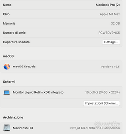 Vendo MacBook Pro 16" con chip Apple M1 Max, in condizioni impeccabili, sempre tenuto con cura.