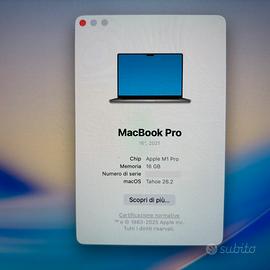 Come da titolo vendo un MacBook Pro da 16” M1 Pro, compreso di scatola originale e alimentatore originale, un ottime condizioni. Specifiche: - Display 16” Liquid Retina XDR - Apple M1 Pro 10-core 16-core GPU - 16 GB di RAM - SSD 512 GB - Colore: Grigio Siderale Batteria: - Condizioni: Normale - Capacità massima: 92% - Cicli di ricarica: 125 Preferendo la consegna a mano sono comunque disponibile alla spedizione.