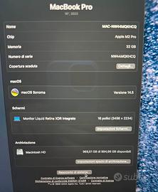 MacBook Pro 16,2” (modello 2023) con chip Apple M2 Pro, 32 GB di RAM e SSD da 1 TB.
