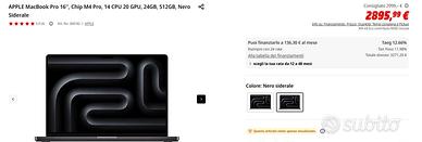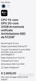 Buongiorno a tutti, vendo l'ultimo modello di MacBook Pro in versione da 16 '' con chip M4 Pro, 24 GB di memoria RAM, e 512 di spazio SSD. (disponibile su richiesta anche la versione con 48GB di RAM e 512GB di SSD) Il Mac è NUOVO sigillato, ancora da scartare, nel suo imballo originale. Per chi effettuerà lo scambio a mano di persona, sarà possibile eseguire in diretta l'attivazione e prima configurazione. Attenzione: si tratta di una macchina per professionisti o, in ogni caso, per utenti consapevoli, che necessitano realmente di questa potenza. Pertanto, sconsiglio in generale l'esborso economico agli utenti che fossero interessati ad un prodotto del genere per mera estetica: un macbook air moderno con chip ARM, come testimoniato dalla recensioni online, offre performance di livello altissimo ed un'esperienza d'uso completa al 100%, senza necessità di ripiegare sulla serie PRO, come accadeva qualche anno fa, quando venivano ancora adottate le CPU Intel x86. Pertanto, visto il prezzo già ben scontato rispetto al listino, nonchè a quanto offerto street price online, non si accettano ulteriori sconti. Resto a disposizione per ogni chiarimento si renda necessario. Sono disponibile per il momento allo scambio a mano, che avrà priorità. (regione Emilia-Romagna e Marche) Utente verificato. Si offre e richiede massima serietà.