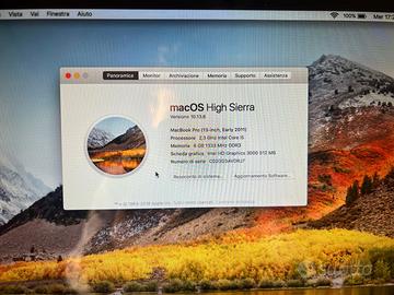 Apple MacBook Pro anno 2011 modello a1278. IN PERFETTE CONDIZIONI! È un modello ancora performante. Specifiche: Processore: Intel Core i5; Ram: 8gb; Archiviazione: 256gb di SSD; Scheda video: Intel HD Graphics 3000; Batteria in ottime condizioni; Sistema operativo: Mac Os High Sierra. Il Mac è ottimo per lavorare, studiare, prendere appunti, giocare a giochi leggeri ecc... Inoltre tutto funziona e ci mette pochissimo ad essere acceso ed operativo. Il Mac viene consegnato da configurare. Per qualsiasi dubbio, non esitate a contattarmi. Prezzo non trattabile. Astenersi perditempo.