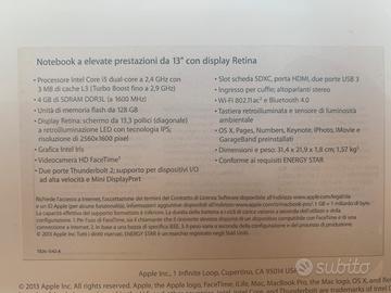 Vendo come da titolo Macbook Pro del 2013 modello 13”. Comprato da un rivenditore due anni fa, l’ho usato esclusivamente per l’università (insieme a una tavoletta grafica) e per guardare serie tv. Programmi come OneNote e il pacchetto Office funzionano ancora benissimo. Come si vede dalle foto, è presente un graffio sulla scocca e un difetto sul monitor. Inoltre il display soffre del classico problema dei Macbook di quegli anni che, come si evince dalle foto, a monitor acceso non si vede. Il layout della tastiera è in francese, ma allego membrana per i caratteri in italiano. Fornisco scatola originale e scontrino di acquisto del primo proprietario. La spedizione avviene esclusivamente tramite TuttoSubito. Il prezzo è da intendersi spedizione inclusa e protezione acquisti esclusa. Rimango a disposizione per altre informazioni e fotografie.