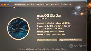 Vendo MacBook Pro 2014, perfettamente funzionante, 8GB di RAM e 128GB di memoria SSD con processore intel i5. Utilizzato solo per studio personale, quindi in buone condizioni sia estetiche che funzionali. Cedo con scatolo originale caricabatterie originale e cover protettiva.