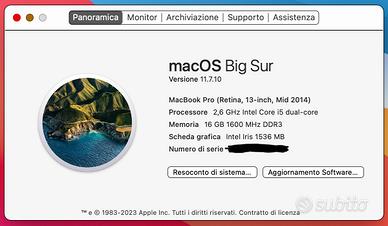 Vendo in buono stato MacBook Pro (Retina, 13-inch, Mid 2014) Processore 2,6 GHz Intel Core i5 dual-core SDD 256GB RAM 16 GB.