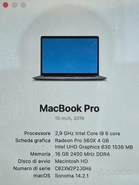 MacBook Pro 15" Retina Versione touch bar Processore i9 2.9GHz 6 core RAM 16GB Disco: 1TB SSD Radeon Pro 4GB